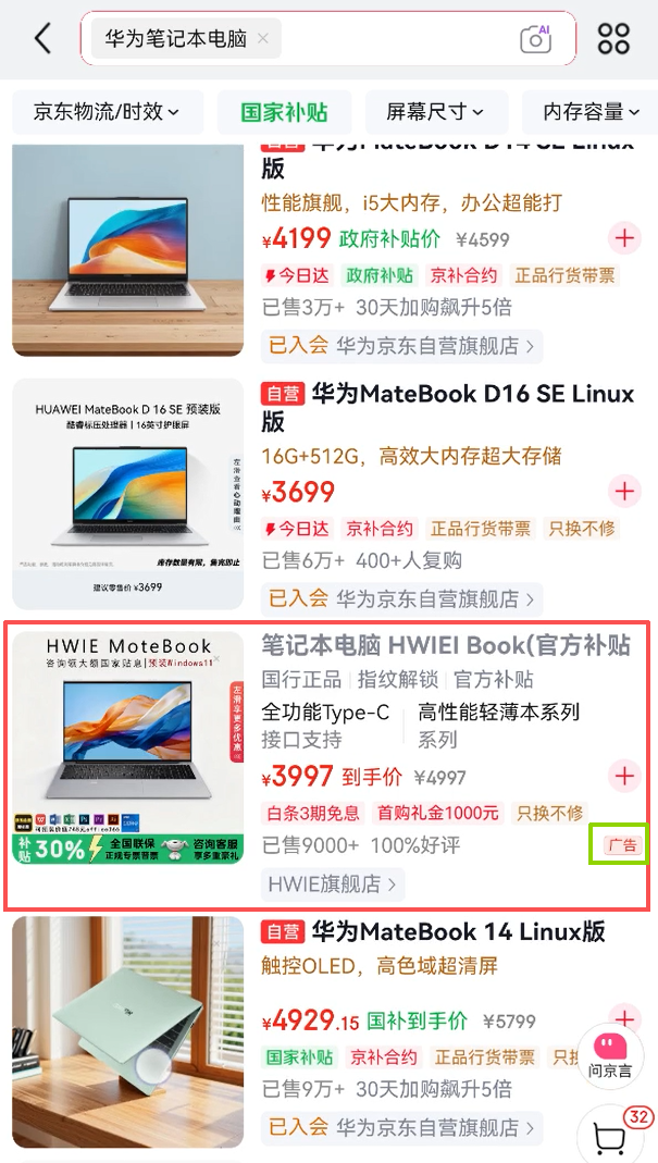 这家店铺里着实定先容里并未出现“华为”字样,她又是若何搜到的?《IT时报》记者尝试在京东搜索“华为札记本电脑”,一家名为“HWIE旗舰店”的店铺在首屏出现了6次,且齐标有“告白”字样,其店铺确定先容、家具页与金宏达电脑整机专营店如出一辙。