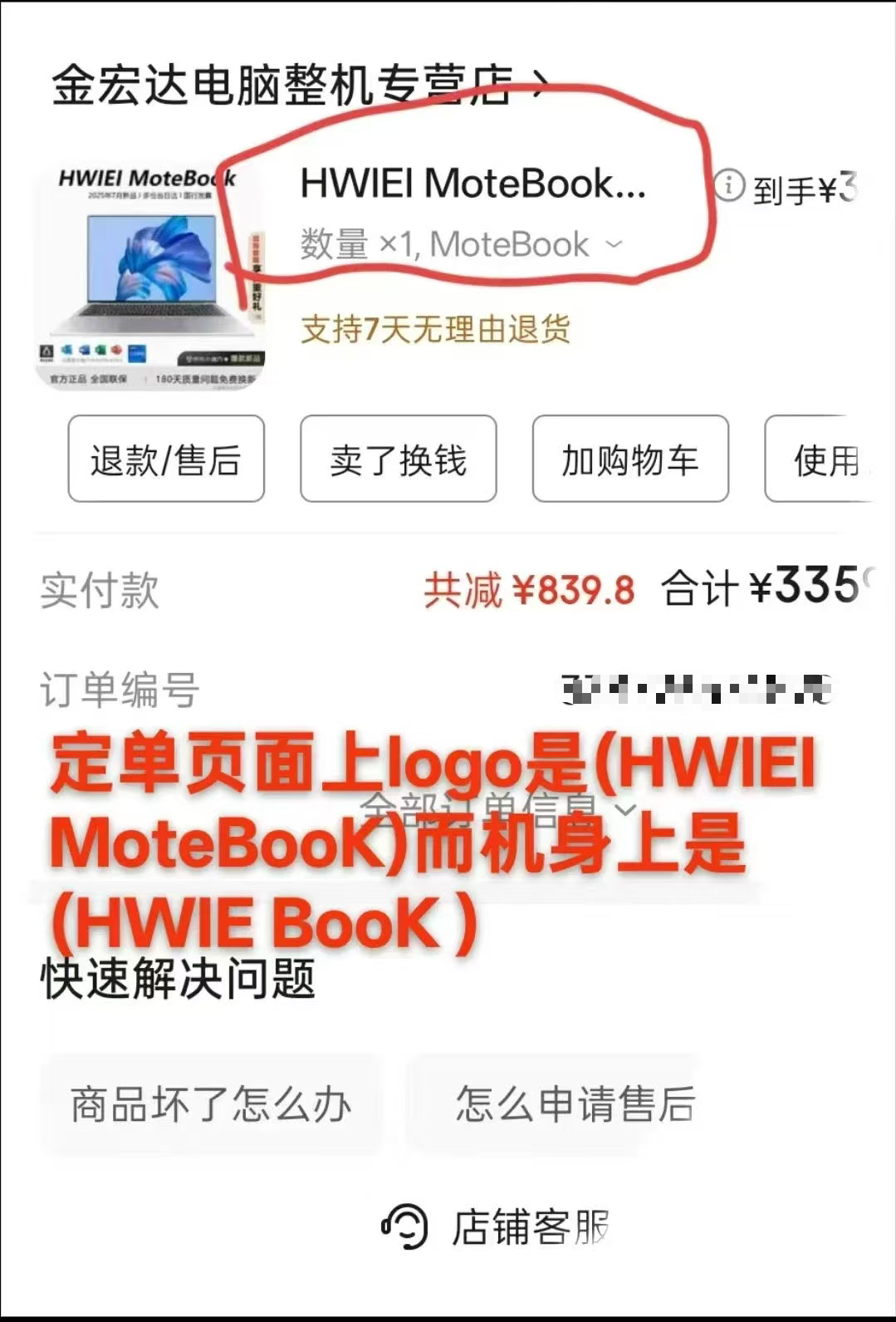 购买时,王女士在京东搜索“华为札记本电脑”等关键词,当看到金宏达电脑整机专营店较有性价比后便下单了,收到后,她才发现我方购买的“华为札记本电脑”实则是“HWIEI MoteBook”,令东说念主哭笑不得的是,电脑机身上刻的是“HWIE Book”,统统货不合板。